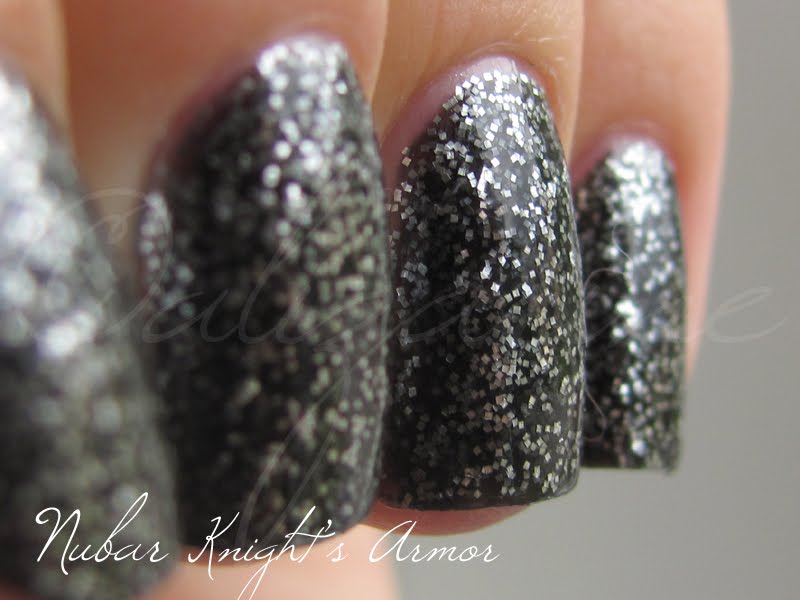 The idea is perfect. By using square glitter particles, it should have been harsh and blunt enough to really do remind us of armors. But the glitter is a bit troublesome in that it just isn't very easy to distribute evenly all over the nail. I'm thinking maybe that's part of the idea too, because it made my personal nail plate armor look all ragged and like it has been... ...out to war. Umm.