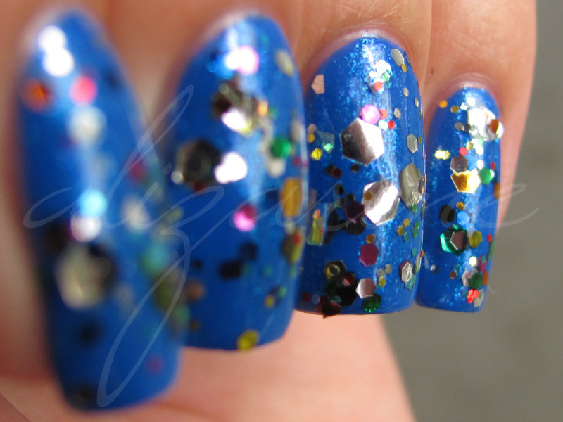 This is the hands of Carissa and her daughters. In exchange for the super large package of goodies Cari sent me a while ago, I had sent them a few of my Swedish favourites in return. I had been told in advance that at least one of the girls had a huge thing for blue polish, so along with the rest I had tossed in a bottle of H&M Blue My Mind and Depend 252, as well as a spare bottle of the crazy Lippmann-esque glitter Carnival from NYX Girls. Apparently, these made the girls so giddy they wanted matching manicures for a birthday party, and Cari managed this "swapping appreciation" photo. Being a mom myself, I got the biggest smile on my face as I opened it. [heart]I thought the girls had managed a super layering combo here, so I wanted to try it out myself! Though I had two crazy Happy Birthday sorta glitters I couldn't decide between, so I ended up using both.