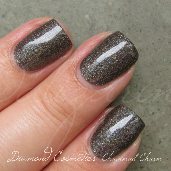 Chainmail Charm from Diamond Cosmetics. Not to be confused with some identical and much more expensive bottles- this one is 2 bucks. Subtle holo effect, but lots of the holos himmer in a brownish charcoal jelly base. This is three coats! It does look good after two, but the third coat adds depth and makes it look a lot less brown.This poor baby has been waiting for my inspiration for a very long time. Of the Diamond COsmetics polishes I once got yself, this was not the first one to be tried, but of course a green one. However, I enjoyed wearing this one more than I thought, even though I am not one of your typical holo loving gals. But do you know what impressed me the most..? This polish in combination with Nubar's Foundation base coat and the new, sucky, version of Diamont, got through a work shift at the asswiping community with only one chip- where I had done some heavy glueing on my nail -and otherwise intact! Do you know how much it takes for a manicure to live through that? We are talking lots of water, soap and desinfectants here! Bravo.